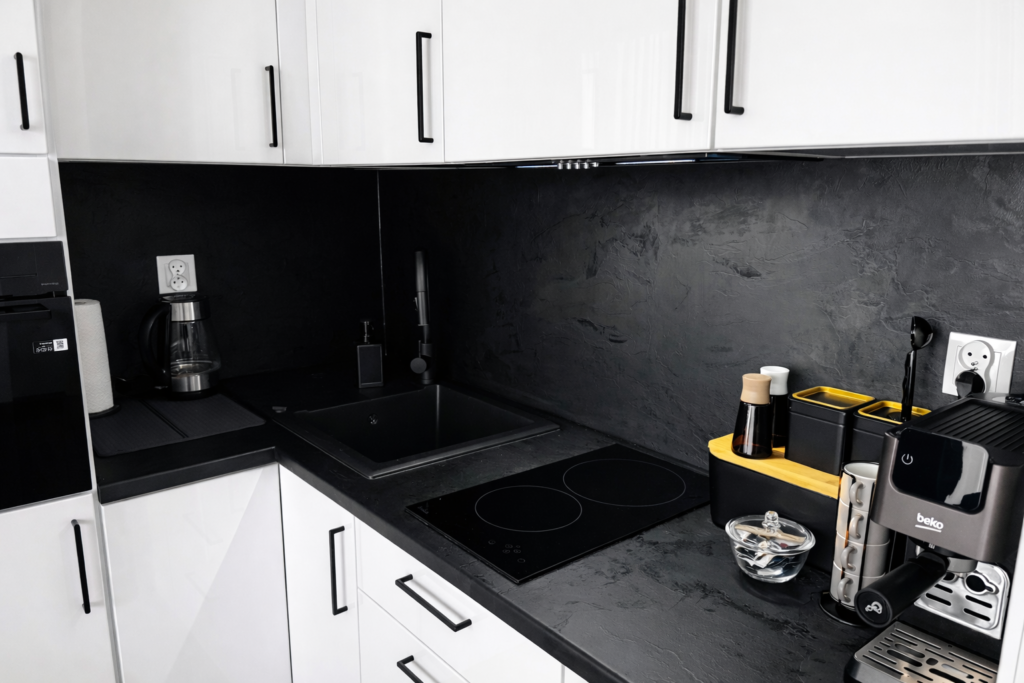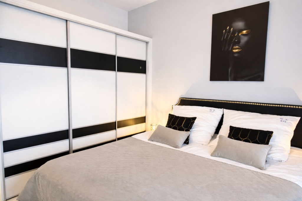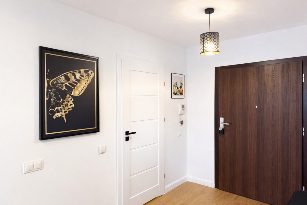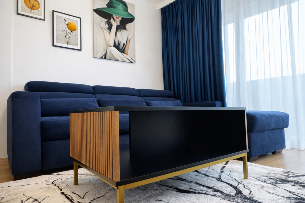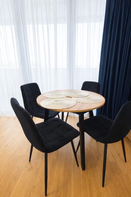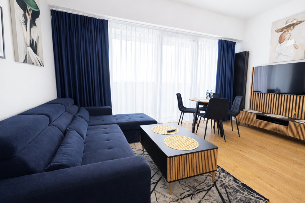 Wnętrze apartamentu zostało zaprojektowane z myślą o wygodzie i funkcjonalności, oferując przestrzeń idealną zarówno na krótki pobyt, jak i dłuższe zamieszkanie.