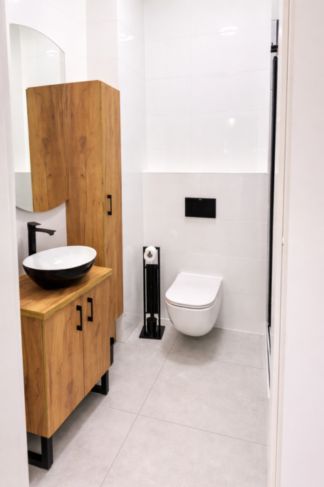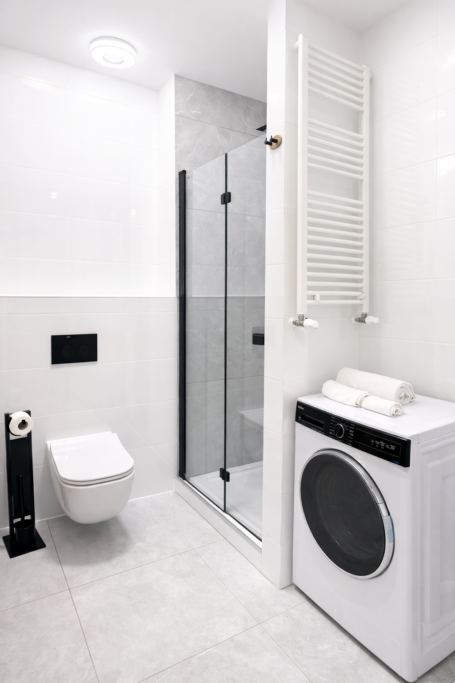 Łazienka: Nowoczesna łazienka z prysznicem, zapewniająca komfort i funkcjonalność.